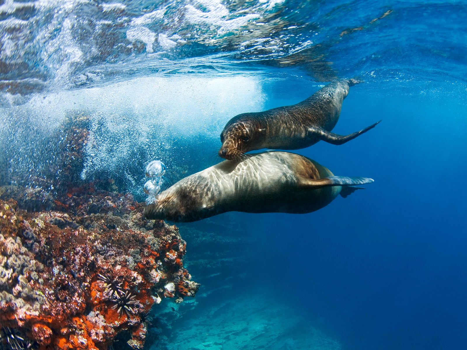 Все животные на снимках – самки, несмотря на обманчивую романтичность отдельных кадров. Огромные самцы, которых легко отличить по роскошной гриве (отсюда и название животного) в это время лежат на каменистом берегу, охраняя свою территорию и многочисленный гарем, численность которого может достигать двадцати особей женского пола. При съемке таких быстрых животных традиционная тактика «подплыл-снял» не работает, лучший способ получить динамические снимки – начать играть с животными в догонялки (морские львы очень общительны и имеют игривый характер).